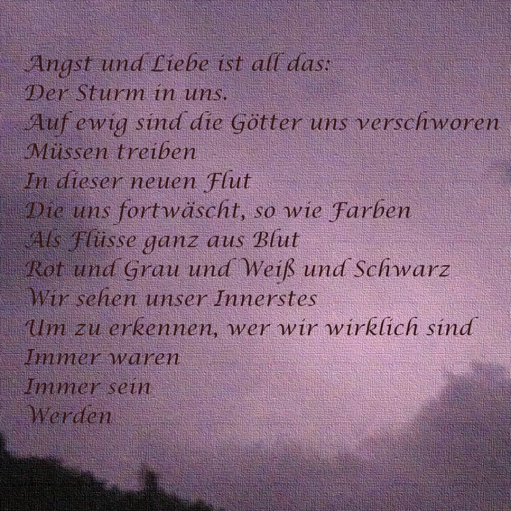 Entstanden ist das Gedicht Hinter dem Sturm beim Fasten im Juli 2018. Ich las in dieser Zeit Die Sturmlichtchroniken von Brandon Sanderson, ein wirklich großartiges Fantasy-Epos, und lies mich vom Schicksal der Figur Kaladin sehr stark mitreißen. Gleichzeitig gab es einige Tage lang ein Dauergewitter, vor welchem ich manchmal lange saß und einfach nur in die Wolken meditierte. Dort, hinter dem Gewitter, hinter dem Sturm, hinter den Wolken schien etwas verborgen zu sein. Die Sturmmeditation brachte dieses Gedicht hervor.