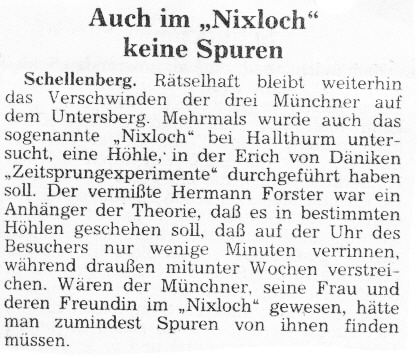 Das Nixloch ist dabei genau die Höhle, die angeblich von Däniken für seine „Zeitreise-Expedition“ ausgesucht wurde. Das Reichenhaller Tagblatt vom 27.08.2987 setzt diese Höhle mit Däniken und den verschwundenen Wanderern in Verbindung: