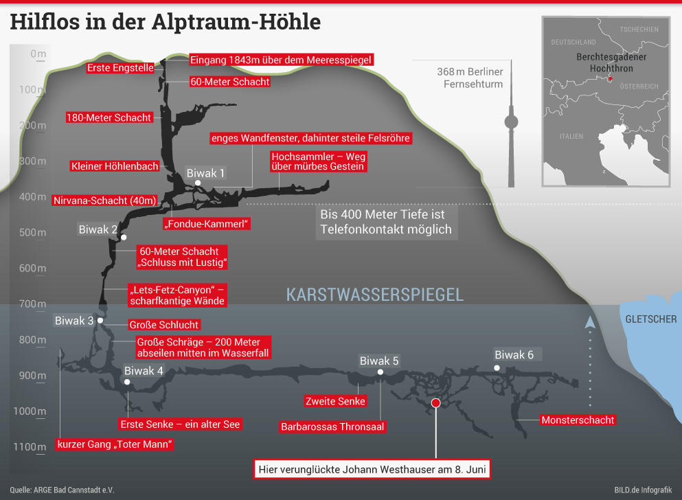 Auf den Unfall möchte ich hier nicht weiter eingehen. An der obigen Infografik von Bild.de ist jedoch noch einiges interessant: So benannten die Forscher z.B. einen Teil der Höhle in beinahe 1000m Tiefe als „Barbarossas Thronsaal“, in dessen Nähe der Unfall stattfand. Der hintere Bereich bei Biwak 6 wird auf einigen Plänen auch als „Auenland“, hier aber als „Monsterschacht“ bezeichnet.