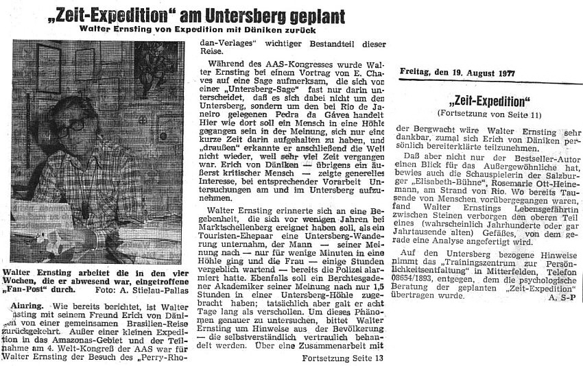 - 1977 machten Erich von Däniken und Walter Ernsting eine „Zeit-Expedition“ zum Untersberg, um die Zeitphänomene, von denen sie in alten Geschichten gehört hatten, zu erforschen. Dabei erfuhren Sie angeblich nicht nur die erwarteten Zeitphänomene, sondern teleportierten auch noch vom Höhlensystem des Untersbergs zu dem in Rio de Janeiro liegenden Berg Pedra da Gávea.